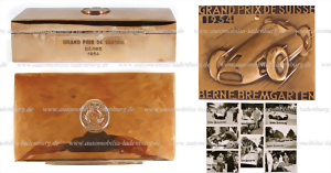 Grand Prix Bern 1954, Konvolut 10tlg., darunter Zigarettenschatulle (800 Silber vergoldet), „Grand Prix Suisse 1954“, 15,5x8,5x4cm (Hersteller Joaillier WILLY JFF Berne Bijoutier); Teilnehmerplakette „Grand Prix de Suisse 1954 Berne Bremgarten“ 6x7cm, dazu 8x original s/w Aufnahmen (teilweise handsigniert), Hans Herrmann auf Mercedes Benz W196 Formel 1, er belegte den dritten Platz hinter dem Sieger Fangio und dem Ferrari Piloten Froilan Gonzalez, 10x14cm