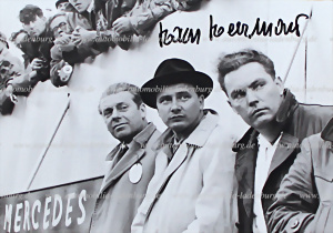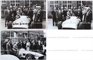 24. Oktober 1955, Konvolut 3 original s/w Aufnahmen (1x handsigniert), die Mercedes Benz Rennmannschaft mit Alfred Neubauer, Hans Herrmann, Graf Berghe von Trips, Peter Collins, Piero Taruffi, John Fitch, Werner Engel, Juan Manuel Fangio, Olivier Gendebien, Karl Kling, Piero Taruffi...bei der Abschiedsfeier 1955, 10x15cm
