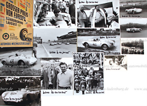 Grand Prix Deutschland 1954, Konvolut 14tlg., darunter 13 original s/w Aufnahmen (teilweise handsigniert) Hans Herrmann auf Porsche 550 Spyder, erster Platz, dazu original Rennprogramm