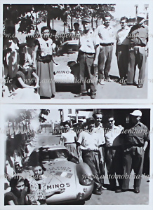 Carrera Panamericana Mexiko 1953, Konvolut zwei original s/w Aufnahmen, das Porsche 550 Coupe, neben dem Wagen Hans Herrmann, Jaroslav Juhan, Karl Kling und der Präsident des Automobilclub von Guatemala, 7x10cm