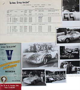 Carrera Panamericana Mexiko 1954, Konvolut 8tlg., darunter 6 original s/w Aufnahmen, darunter wunderschönes Foto der 4 Porsche 550 Spyder von Herrmann, Juhan, Segura und Chavez..., Evans mit Segura vor dem Porsche 356SL (#356/2-054), dazu Reglement in deutscher Ausführung, sowie 4 Seiten offizielle Ergebnisliste