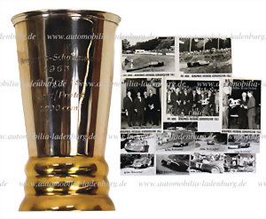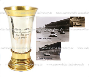 1000km Nürburgring 1956, Konvolut 4tlg. darunter Siegerpokal (silber 835) „II Internationales ADAC 1000km Rennen auf dem Nürburgring – 27.05.1956 – Ehrenpreis Renn- Sportwagen bis 1500ccm 2. Preis“, Höhe 17,5cm, dazu 3 handsignierte original s/w Aufnahmen, Herrmann / von Frankenberg auf Porsche 550 Spyder, das Duo belegte den zweiten Platz in der Klasse und den 6. Platz im Gesamtklassement, verschiedene Formate