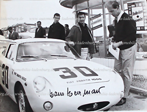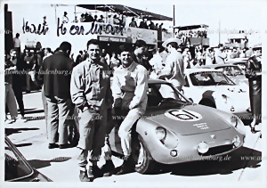 12 Stunden Sebring 1963, handsignierte original s/w Aufnahme, Hans Herrmann und Tommy Spychiger mit dem Abarth Simca 1300, die beiden Fahrer belegten den ersten Platz in der Klasse 1300, 13x18cm