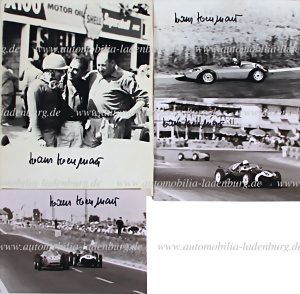 Coupe Internationale de Vitesse Reims 1959, Konvolut 4 handsignierte original s/w Aufnahmen, Hans Herrmann auf Behra Porsche F2, ein Foto zeigt Herrmann zusammen mit Behra der nur 4 Wochen später beim Avus Rennen in Berlin tödlich verunglückte, (Herrmann belegte in Reims den zweiten Platz), verschiedene Formate