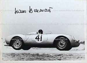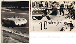 Solitude Rennen 1956, Konvolut zwei handsignierte original s/w Aufnahmen, Hans Herrmann belegte den ersten Platz auf Porsche 550 Spyder, 10x7cm