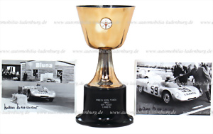 Aspern 1963, Konvolut 5tlg., darunter Siegerpokal „Preis von Wien 1963 – Sportwagen über 1600ccm 1. Preis“, Höhe 36,5cm, dazu 4 handsignierte original s/w Aufnahmen, Hans Herrmann auf Abarth 1000TC, 1000GT und 2000 SP (1. Platz), ein Foto zeigt Herrmann zusammen mit Charles Vögele, 13x18cm