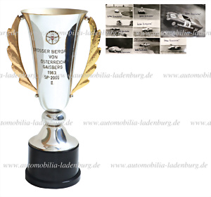 Internationaler Alpen Bergpreis 1963, Konvolut 9tlg., darunter Siegerpokal „Großer Bergpreis von Österreich Gaisberg 1963 SP – 2000 II“, Höhe 26,5cm, dazu 8 handsignierte original s/w Aufnahmen, Hans Herrmann auf Abarth 2000SP (2. Platz in der Klasse) und Abarth Simca 1300 (2. Platz in der Klasse), verschiedene Formate