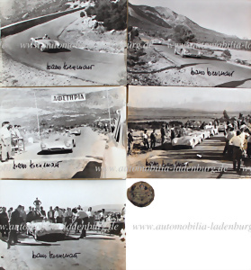 Mont Parnes 1957, Konvolut 6tlg., darunter 5 handsignierte original s/w Aufnahmen, Herrmann und Jüttner auf Borgward Hansa 1500 RS, 18x24cm, dazu Siegermünze für den zweiten Platz im Gesamtklassement, D: 5cm