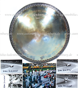 Großer Preis der Solitude 1960, Konvolut 5tlg., darunter Siegerpreis, Silberschale (925 silber) „Internationales Solitude Rennen 1960 – Ehrenpreis des Stuttgarter Karosseriewerk Reutter & Co“, Durchmesser 34,5cm, dazu 4 handsignierte original s/w Aufnahmen, Hans Herrmann auf Porsche 718 F2, Herrmann belegte den zweiten Platz hinter von Trips auf Ferrari 246P Dino F2, 8x13cm