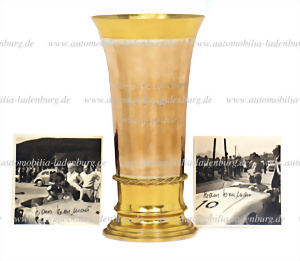 Gaisbergrennen 1957, Konvolut 3tlg., darunter Silberpokal (835 silber) „Großer Bergpreis von Österreich 1957 – Gaisberg – Salzburg Ehrenpreis ADAC“, Höhe 20,5cm, dazu zwei handsignierte original s/w Aufnahmen, Hans Herrmann (mit Helm von Edgar Barth) und Giulio Cabianca auf Borgward Hansa 1500 RS, 9x9cm (1. Platz in der Klasse und zweiter Platz im Gesamtklassement)
