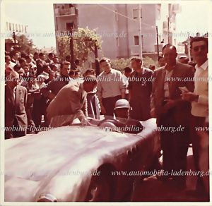 Aosta – San Bernardo 1957, original Farbfoto, Hans Herrmann mit Fritz Jüttner (1. Platz in der Klasse und 3. Platz im Gesamtklassement), 9x9cm