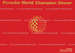 Hotel International Stuttgart, 5. Dezember 1970, „Porsche World Champion Dinner“, innen handsigniert von Jo Siffert, Brian Redman, Pedro Rodriguez, Vic Elford, Kurt Ahrens, Hans Herrmann, Richard Attwood, Björn Waldegaard, Andersson, Larrousse, van Lennep und Jürgen Neuhaus, guter Zustand