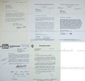 Konvolut Schriftverkehr (5 Briefe), darunter Schreiben vom 22. Juni 1978, handsigniert Stirling Moss, Schreiben vom 16.9.1993, handsigniert Manfred von Brauchitsch, dazu zwei Schreiben von Daimler Benz, Direktion und Vorstand 1977 und 1978