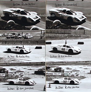 12 Stunden Sebring 1968, Konvolut 6 handsignierte original s/w Aufnahmen, die Porsche 907 von Siffert / Herrmann (Gesamtsieger), Elford / Neerpasch (2. im Gesamtklassement), und Mitter / Stommelen (ausgefallen), 13x18cm
