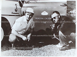 1953, original s/w Aufnahme, Karl Kling und Hans Herrmann mit dem Chevrolet Suburban von „Fletcher Aviation Corp.“, Herrmann und Kling prüften hier den Straßenbelag der Carrera Panamericana in Mexiko, 16x21cm