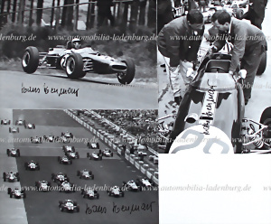 Grand Prix Deutschland Nürburgring 1966, Konvolut 3 handsignierte original s/w Aufnahmen, Hans Herrmann auf Brabham F2 (4. Platz), 13x18cm
