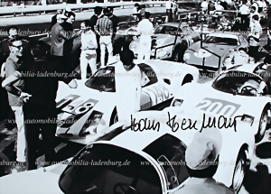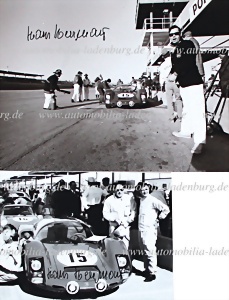 Targa Florio 1966, original s/w Aufnahme (handsigniert) die Rennwagen vor dem Start, im Bild ist links Huschke von Hanstein zu sehen, rechts im Bild der Porsche 906E von Herrmann / Glemser, 13x18cm