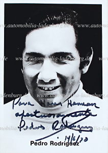 Handsignierte Autogrammkarte mit Widmung an Hans Herrmann „...Pedro Rodriguez“, 15x10cm