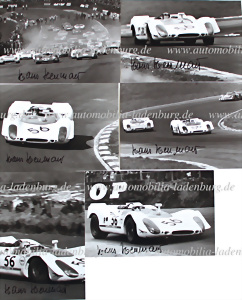 500 Brands Hatch 1969, Konvolut 6 handsignierte original s/w Aufnahmen, Herrmann / Stommelen auf Porsche 908 Spyder, 5. Platz im Gesamtklassement, 13x18cm