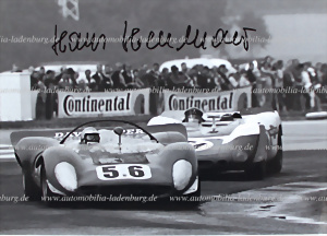 1000km Nürburgring 1969, Konvolut 3 handsignierte original s/w Aufnahmen Herrmann / Stommelen auf Porsche 908 Spyder (2.Platz im Gesamtklassement), 21x30cm