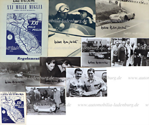 Mille Miglia 1954, Konvolut 10tlg., darunter Streckenplan, Reglement, dazu 8 original s/w Aufnahmen (teilweise handsigniert), Hans Herrmann und Herbert Linge auf Porsche 550 Spyder (#550-08), Herrmann / Linge belegten den ersten Platz in der Klasse 1500ccm und den 6. Platz im Gesamtklassement, verschiedene Formate