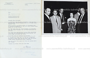 23.12.1960, Schreiben von Alfred Neubauer an Mina Schlauder (Mutter von Hans Herrmann), Neubauer bedankt sich hier für ein Weihnachtsgeschenk...handsigniert Neubauer, dazu eine original s/w Aufnahme, Fangio, Herrmann, Geier, Baronin von Korff und Neubauer, 18x24cm