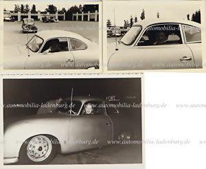 1953, Konvolut 3 original s/w Aufnahmen, Hans Herrmann mit einer Frau Plagmann am Steuer seines Porsche 356 1500 super „split window“, ein Foto rückseitig mit Widmung, verschiedene Formate