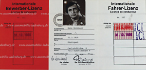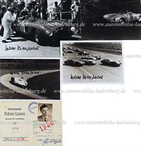 8.3.1956, Internationale Fahrer Lizenz von Hans Herrmann, inkl. Passfoto, dazu 4 handsignierte s/w Aufnahmen (spätere Abzüge), Hans Herrmann auf Ferrari 290 MM (#0616MM), Porsche 550 Spyder...