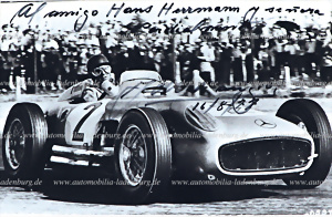 16.8.1977, handsignierte s/w Aufnahme mit Widmung Juan Manuel Fangio für Hans Herrmann, 11x17cm