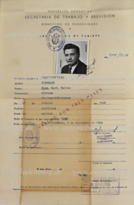 9. Dezember 1954, Einreisegenehmigung für Argentinien (3 Monate gültig), erstellt für die Teilnahme beim Grand Prix in Argentinien 1955, Hans Herrmann belegte mit Moss und Kling auf Mercedes Benz W196 den 4. Platz. Das Rennen ging als einer der härtesten Hitzeläufe der Grand Prix Geschichte in die Annalen ein...