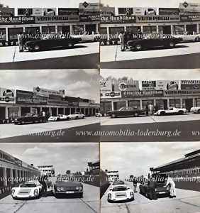 ca. 1966, Konvolut 6 original s/w Aufnahmen, Hans Herrmann mit Peter Falk und Valentin Schäffer bei Versuchsfahrten am Nürburgring mit Porsche 906, 911 targa und Ford OSI 20M, 18x24cm