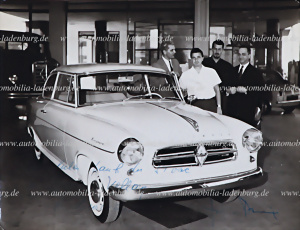 Handsignierte original s/w Aufnahme, signiert von Joakim Bonnier und Hans Herrmann, das Foto zeigt die beiden Rennfahrer in einer Borgward Vertretung in Marokko, 18x24cm