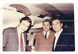 1968, original Farbaufnahme, Jo Siffert, Gerhard Mitter und Hans Herrmann im Flugzeug auf dem Weg zum Rennen in Sebring, 9x13cm