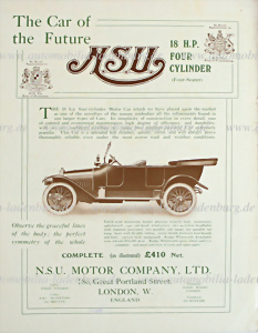 ca. 1913, Faltprospekt NSU 18HP Four Cylinder, 4 Seiten, engl. Text, verschiedene Karossierevarianten u.a. Touring Car, Golfing Model or Doctor´s Car..., selten