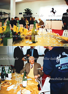 1988, Konvolut 2 original Farbaufnahmen der 90. Geburtstagsfeier von Enzo Ferrari, je 10,2x16cm, Fotos datiert / entwickelt März 1988, Enzo Ferrari verstarb noch im selben Jahr (14.August.1988)