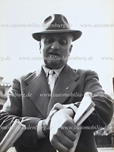 Original s/w Aufnahme (Archivabzug 50er Jahre), Enzo Ferrari mit Baconin Borzacchini, Tazio Nuvolari und Eugenio Sienna, 24x18cm, gestempelt „DuFoto Roma“