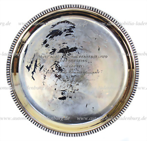 Silberteller (Silber 835), „16.Int. ADAC-1000KM Rennen 31.05.1970 Nürburgring – Ehrenpreis der Daimler-Benz Aktiengesellschaft“, Durchmesser 27cm, Hans Herrmann / Richard Attwood auf Porsche 908/3, 2.Platz in der Gesamtwertung