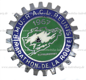 23.-26.August.1967, Teilnehmerplakette „R.M.U.-R.A.C.L. Reunis – Marathon de la Route Nürburgring 1967“, Durchmesser 8,5cm, Hans Herrmann / Vic Elford / Jochen Neerpasch auf Porsche 911R Sportomatic, 1.Platz in der Klasse, sowie 1.Platz in der Gesamtwertung