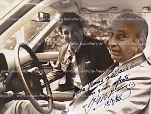Handsignierte original s/w Aufnahme Hans Herrmann mit Juan-Manuel Fangio, signiert von Fangio mit Widmung ans Hans Herrmann und Frau Magdalena, datiert 18.08.1980, 16,5x21,5cm