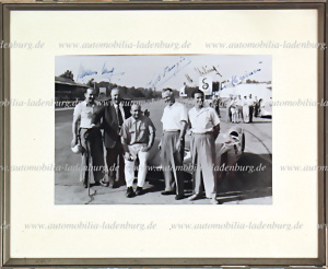 Handsignierte original s/w Aufnahme Mercedes-Benz Rennteam 1954, u.a. signiert von Juan-Manuel Fangio, Karl Kling, Hans Herrmann und Hermann Lang, gerahmt im Passepartout, 27x33cm