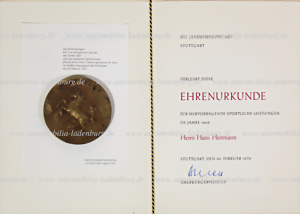 Ehrenurkunde verliehen von der Landeshauptstadt Stuttgart an Hans Herrmann, für hervorragende sportliche Leistungen im Jahre 1969, datiert 20.Februar.1970, signiert vom Oberbürgermeister Klett, dazu Plakette / Medaille „Für Verdienste im Sport 1969“, Durchmesser 9,5cm