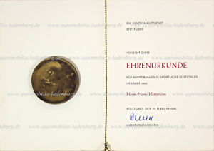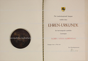 Ehrenurkunde verliehen von der Landeshauptstadt Stuttgart an Hans Herrmann, für hervorragende sportliche Leistungen im Jahre 1968“, datiert 21.Februar.1969, signiert vom Oberbürgermeister Klett, dazu Plakette / Medaille „Für Verdienste im Sport 1968“, Durchmesser 9,5cm