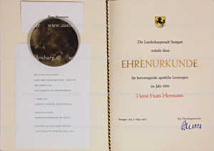Ehrenurkunde verliehen von der Landeshauptstadt Stuttgart an Hans Herrmann, für hervorragende sportliche Leistungen im Jahre 1966“, datiert 03.März.1967, signiert vom Oberbürgermeister Klett, inkl. Plakette / Medaille „Für Verdienste im Sport“, Durchmesser 9,5cm