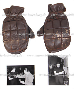 Konvolut 3tlg., darunter ein paar Boxhandschuhe aus dem Besitz von Hans Herrmann, dazu 2 original s/w Aufnahmen, Hans Herrmann beim Boxunterricht, 10,5x14,5cm, gestempelt „HGW-Bild“