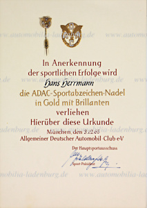 Urkunde des ADAC „In Anerkennung der sportlichen Erfolge wird Hans Herrmann die ADAC-Sportabzeichen Nadel in Gold mit Brillanten verliehen“, datiert 03.12.1965, inkl. goldene Sportabzeichen Nadel (Gold 585)