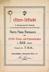 Ehrenurkunde des SAC (Schwäbischer Automobil Club e.V.), „In Anerkennung seiner Verdienste um den deutschen Motorsport und den SAC wird Hans Herrmann das SAC-Treue und Sportabzeichen in Gold verliehen“, datiert 07.12.1963, inkl. goldenes SAC Sportabzeichen