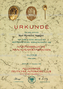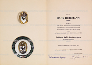 Urkunde des AvD „Hans Herrmann Stuttgart wurde für seine besondere Leistungen und Erfolge im Internationalen Automobilsport-Wettbewerben von Automobilclub von Deutschland e.V. das goldene AvD-Sportabzeichen verliehen“, datiert 29.September.1955, inkl. AvD Sportabzeichen und Plakette, Durchmesser 10,5cm