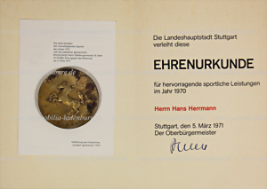 Ehrenurkunde verliehen von der Landeshauptstadt Stuttgart an Hans Herrmann, für hervorragende sportliche Leistungen im Jahre 1970“, datiert 05.März.1971, signiert vom Oberbürgermeister Klett, dazu Plakette / Medaille „Für Verdienste im Sport 1970“, Durchmesser 9,5cm