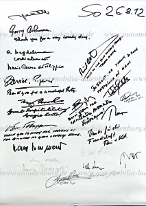 Handsigniertes Veranstaltungsplakat Club International des Anciens Pilotes de Grand Prix F1 50 Ans 1962-2012 Grand Prix Drivers Club“, Rückseite signiert u.a. von Hans Mezger, Herbert Linge, Vern Schuppan, Tony Brooks, David Piper, Maria Teresa de Filippis, Hans Herrmann, Peter Falk, 68x48cm