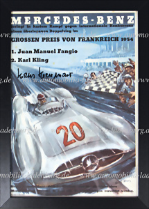 Din A4 Rennplakat „Mercedes-Benz – Grossen Preis von Frankreich 1954“, gerahmt, Glasscheibe signiert von Hans Herrmann, 32,5x23,5cm